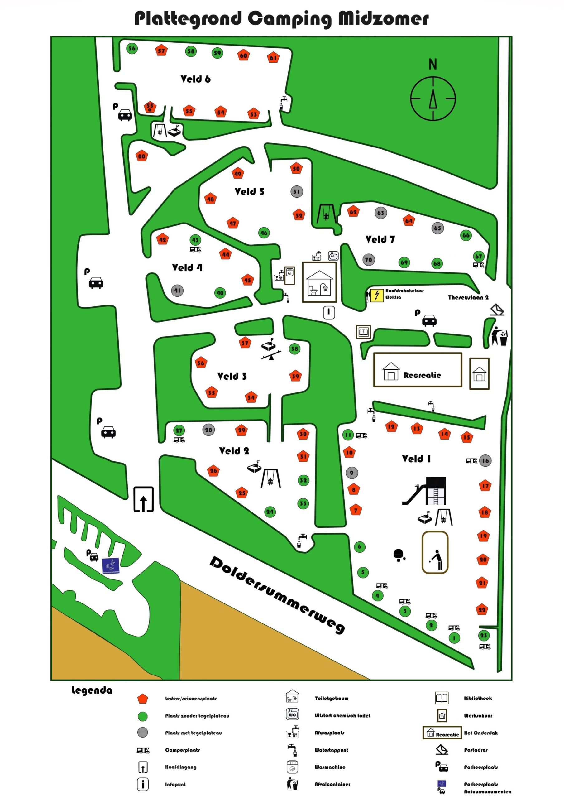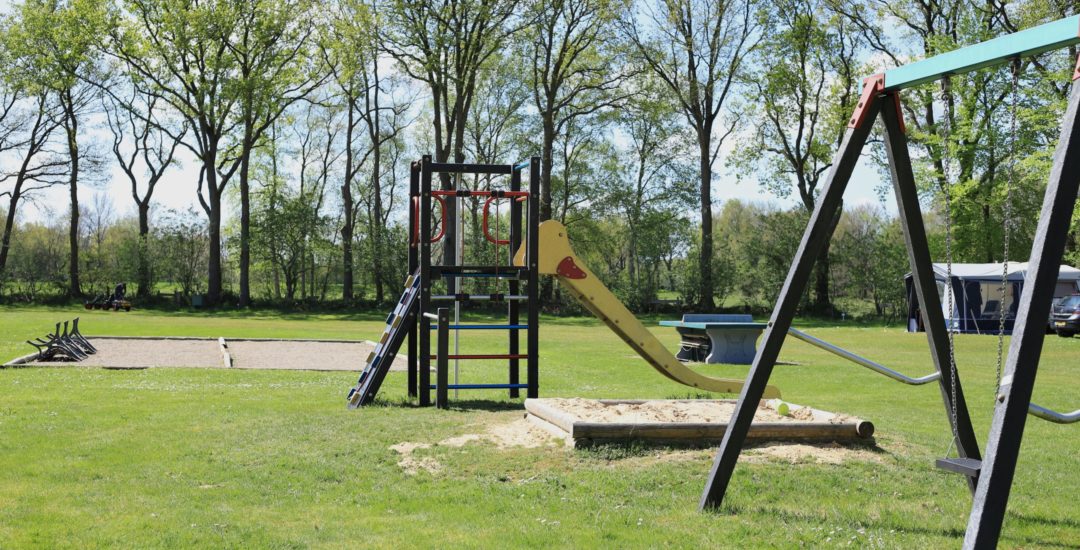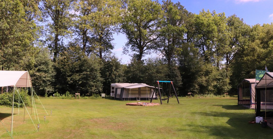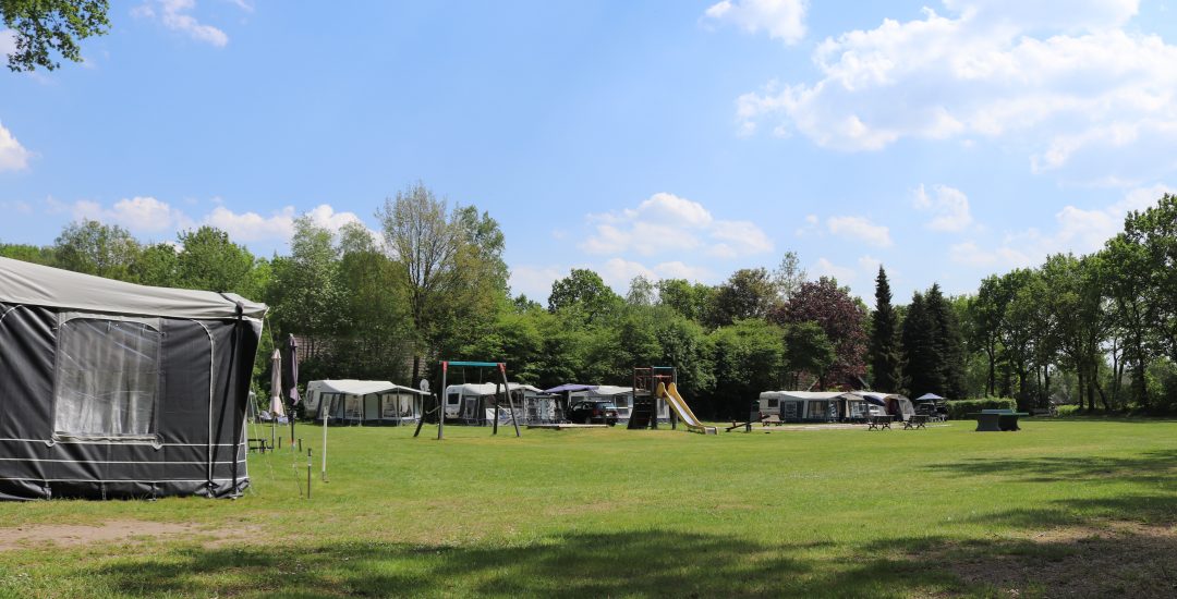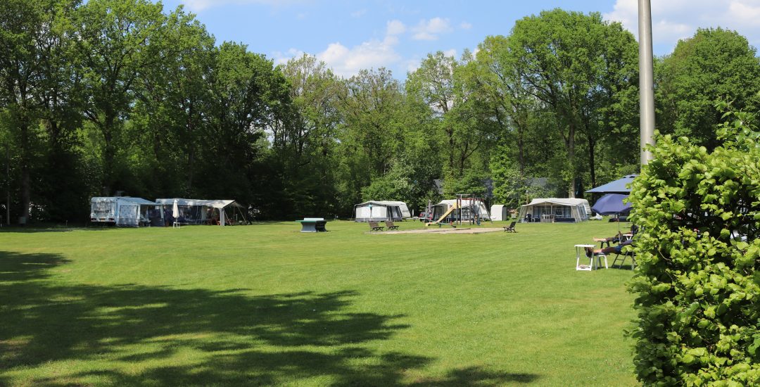 Hieronder staan foto’s die een indruk geven van de verschillende velden op de camping. Er zijn in het totaal zeven velden. Op elk veld is gras en om elk veld heen staan bomen. Verspreid over de camping staan speeltoestellen voor kinderen.